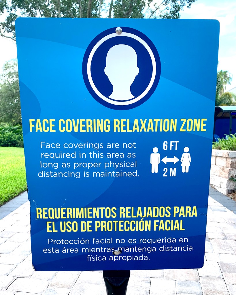 They do offer a few places in the park where you can remove your mask to get some fresh air. They are marked with signs and require that you maintain social distancing when using them.