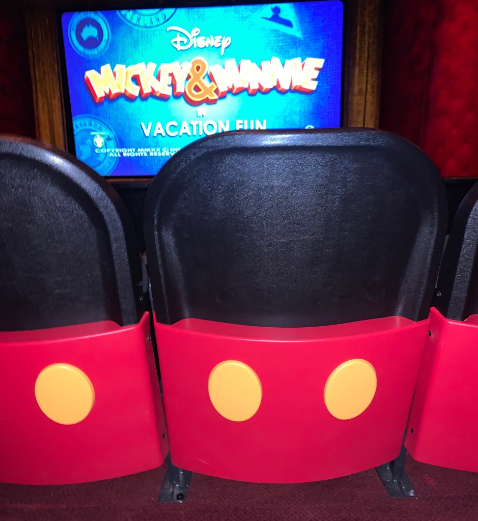 The theater is adorable as soon as you see it, but the seats are the best. Mickey Mouse’s shorts buttons on the seats are so cute! I was smiling as soon as I walked in.