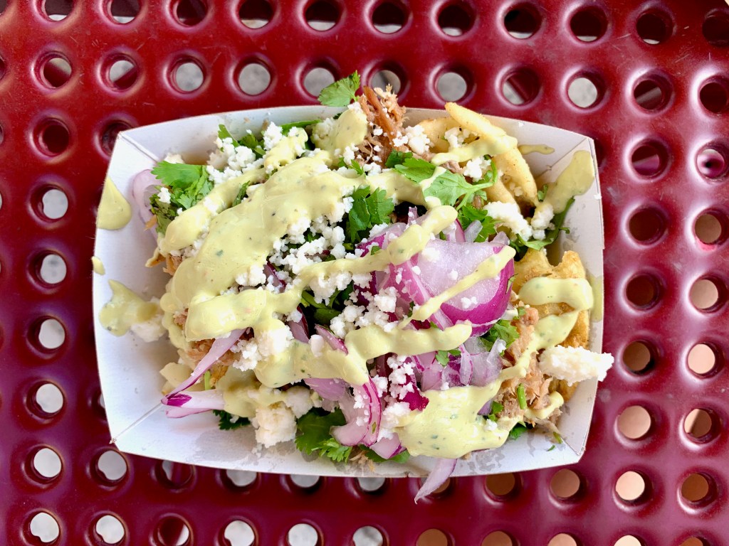 For our second sample, we both got Mojo Roasted Heritage Pork Waffle Potato Nachos topped with avocado crema and cotija cheese. They were absolutely delicious and I’d have them again. So much topping these that you can barely see the waffle fries.