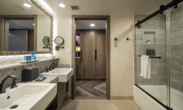 Disney is revealing a first look at a newly imagined room at my favorite Polynesian Village Resort. The new color palette is inspired by the Pacific Ocean and it’s islands. The floors in the bathroom are the color of sand. The accent wall is decorated to resemble tapa cloth.