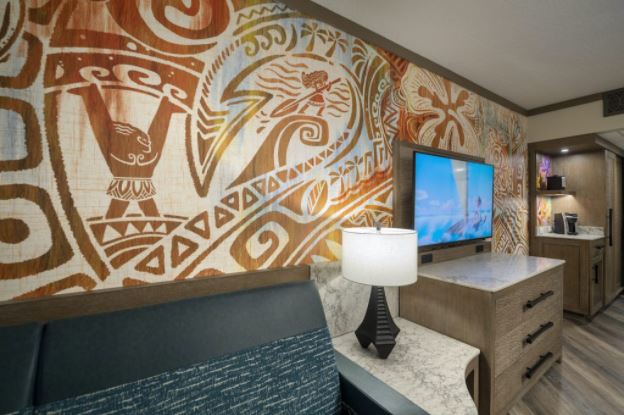 Disney is revealing a first look at a newly imagined room at my favorite Polynesian Village Resort. The new color palette is inspired by the Pacific Ocean and it’s islands. The floors in the bathroom are the color of sand. The accent wall is decorated to resemble tapa cloth.