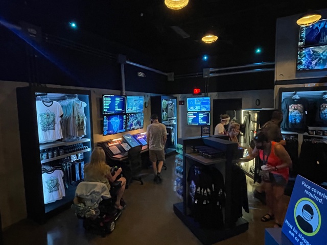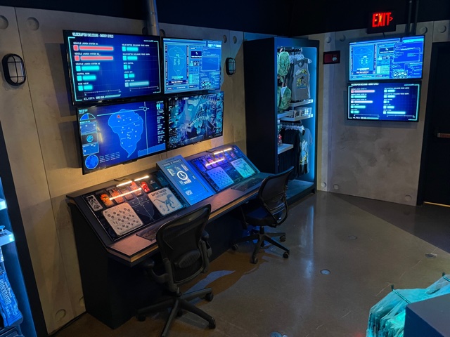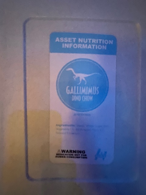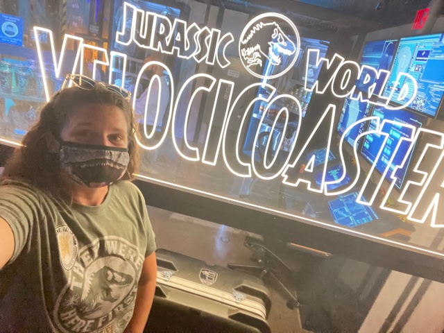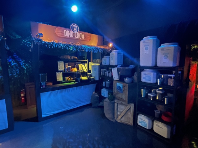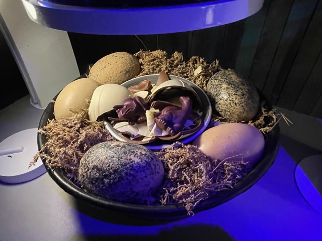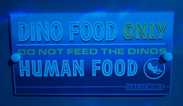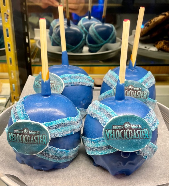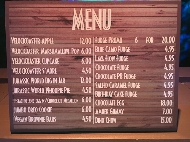 This room is also where you’ll find the snacks for humans. While I was there I was told that they have not received the Dino Chow yet, but it is something with mixed nuts in a collectible container. I’m looking forward to that! They were sold out of the VelocCoaster Marshmallow Pop, Jurassic World Whoopie Pie, and VelociCoaster Cupcake. I was there mid-day, so I guess you’ll have to get there early if you want the biggest selection. The Amber Gummy is pineapple and the mosquitos inside are not real, much to my disappointment, and are candy. The Blue Camo Fudge is blue raspberry. I think I was told the Lava Flow Fudge is chocolate and raspberry, but I don’t recall for sure. The Chocolate Eggs come in three different colors, based on the splatter on them, and have a chocolate dinosaur inside. I’ll either need to get one of them on my way out of the park, or split it with people while I’m there. They are really big and it’s hot AF in Orlando right now so it will melt if you’re trying to walk around the park with it. I tried the Pistachio Egg with Chocolate Medallion. It was messy, but very good. I can’t wait to try more dinosaur treats!