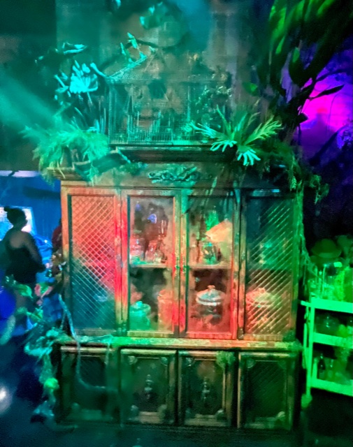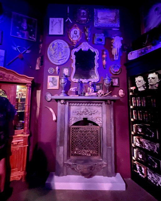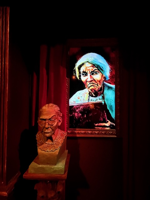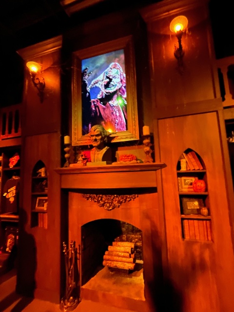 The second room is a library, which is always my favorite room. You’ll find the HHN Icons here. Each has a portrait and a bust. The Caretaker, The Storyteller, The Director, The Usher, and Chance are along the walls. Jack the Clown is above the fireplace.
