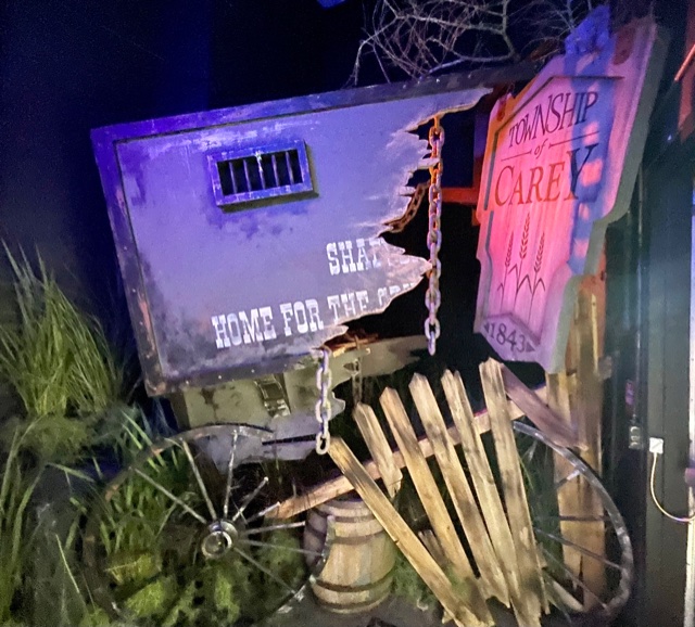 As you exit the store you’ll see the insane asylum wagon that has been wrecked and the Township of Carey sign.