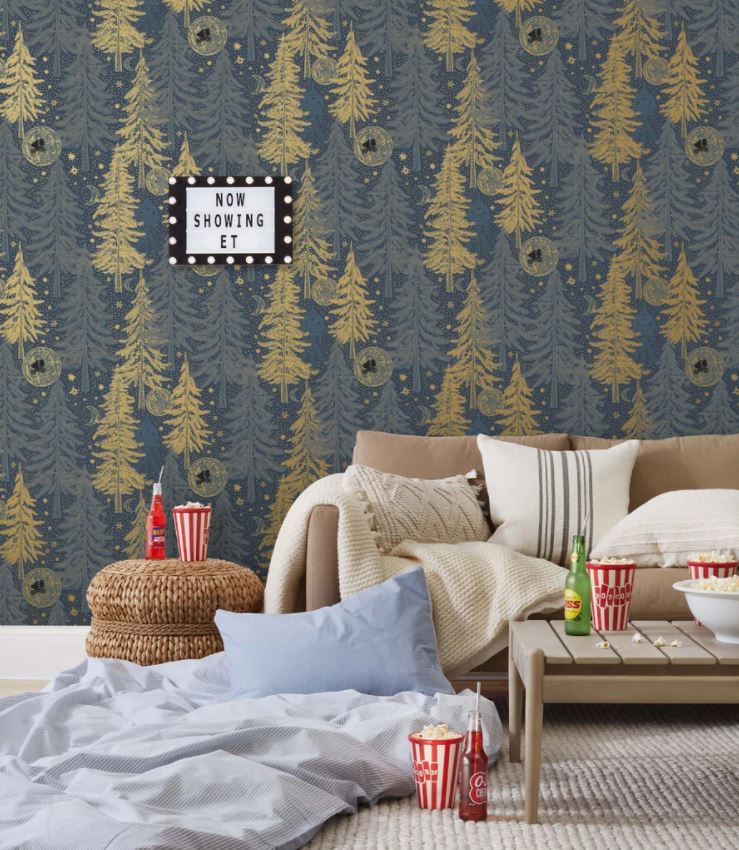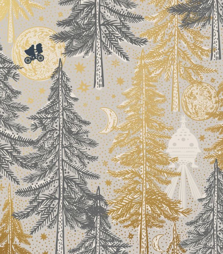 Of course I must show you the E.T. the Extra Terrestrial paper first because E.T. is one of my all-time favorite movies and my favorite attraction at Universal Studios Orlando. Doubt my obsession? My collection has only increased since this article. But, back to the wallpaper. The E.T. collection comes in two colors and is called “Be Good.” It’s subtle and outdoorsy. You’ll notice that E.T. and Elliot are flying past the moon and E.T.’s home ship is in the trees.