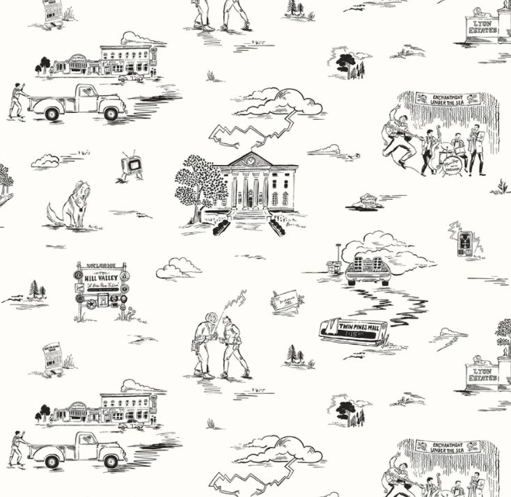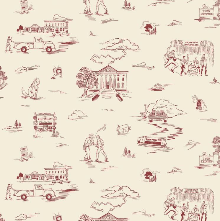 The “Hill Valley Toile” wallpaper also comes in four colors. This Back to the Future wallpaper is set in Hill Valley, CA in 1955. I can see this in a home with an old-time feel to it. Maybe guests wouldn’t even figure out it’s movie paper!