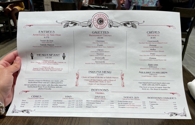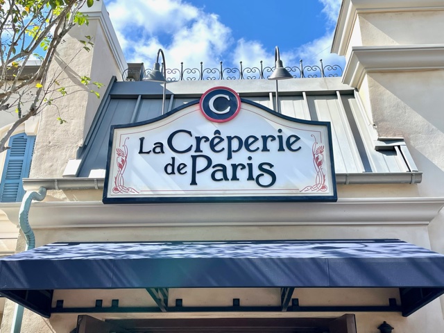 This past weekend I scored boarding group 5 for Remy’s Ratatouille Adventure in the newly expanded France pavilion at Epcot. By the way, it took 12 minutes of hustling as fast as I could with my walker to get back there. Just in case you’re wondering when you get those first few numbers. At that time, it was a walk-on and when I came out the line for the counter at Crêpes À Emporter by La Crêperie de Paris wasn’t too long. I decided to give the restaurant a look.