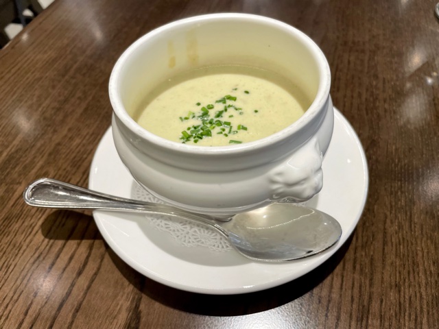 There were so many delicious sounding galettes and crêpes on the menu I had a hard time deciding. I went with the prix fix menu and had the Soupe du Jour (potato leek), the Savoyarde galette, the Poire crêpe, and apple juice. I did ask about the vinaigrette on the Salade Maison and was told it had mustard in it. While it sounded tempting, I still went with the soup.
