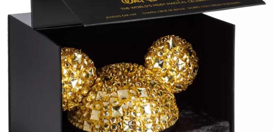 The Walt Disney World 50th Anniversary Jeweled Ear Hat for Adults comes with a $1,000 price tag. The padded ears and cap are covered in golden sequins and rhinestones. It comes in a black, velvet-lined display case and includes a Certificate of Verification. These ears are limited release and there is a limit of one per guest.