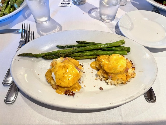 There were four of us dining, but two of us ordered the same thing. Myself and another ordered the Crabcakes Benedict. It’s two crab cakes, prosciutto ham, poached eggs, Old Bay Hollandaise sauce, and grilled asparagus. Think of regular eggs Benedict, then take it to 11. Not even kidding, these were THE SHIT. Like, ridiculously good and worth every penny. JC told us that the crab cakes are 95% crab. It didn’t look like a filling meal when it was set down, but I was too full to even think about sticking anything else into my belly.