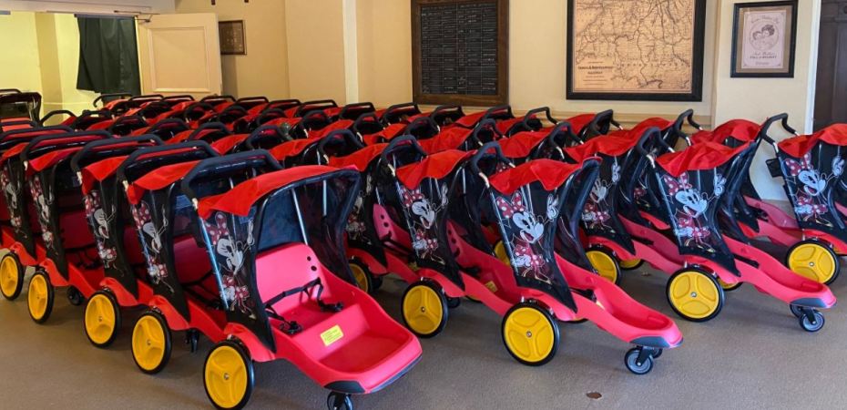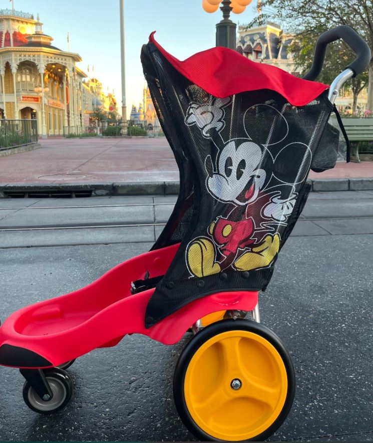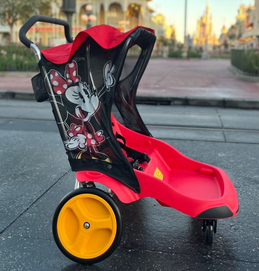 Walt Disney World parks and Disney Springs debut new Mickey & Minnie strollers today! Changing from the different colored strollers that were pretty plain, these are bright red. They feature Mickey Mouse on one side and Minnie Mouse on the other.