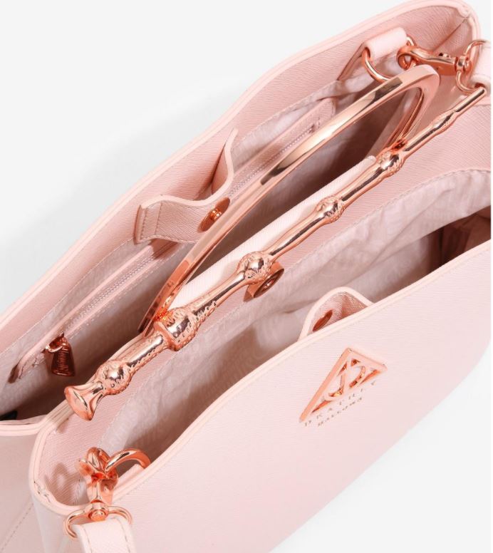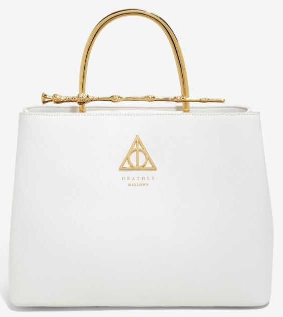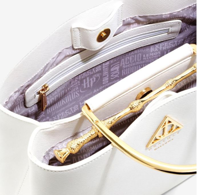 “The sleek faux-leather design features a metal Deathly Hallows badge, brand badge, Elder Wand-shaped handle, two compartments, interior drop and zip pockets, interior lining with an allover spells pattern, magnetic button closure, debossed details, and a removable and adjustable crossbody strap. “