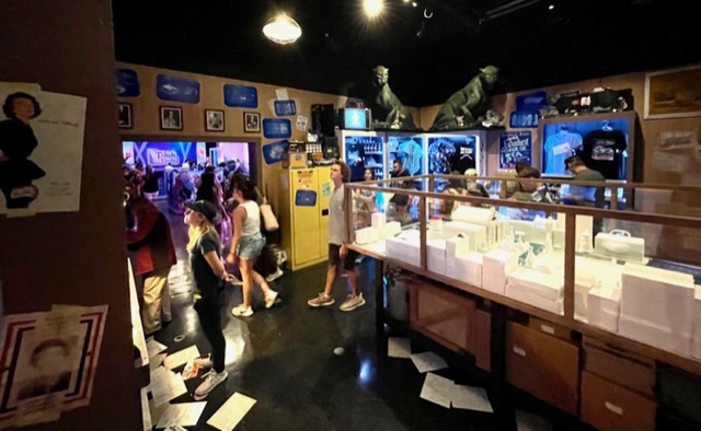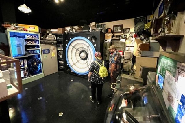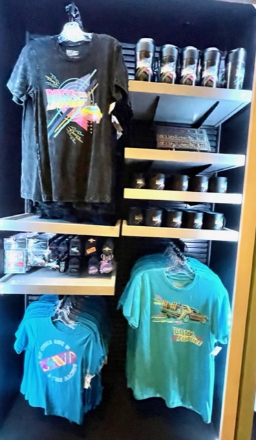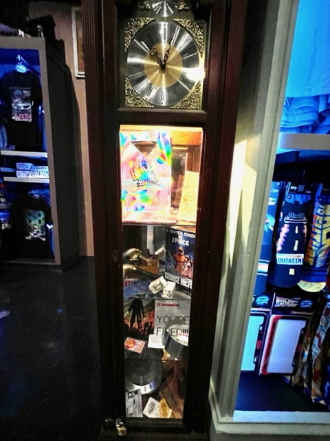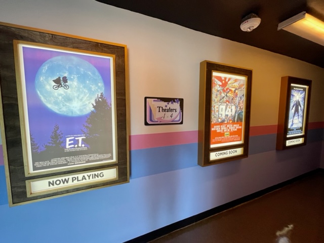 Theater 3 goes back in time with Back to the Future. You’ll find nods to all three films. If you’re looking carefully, you’ll also find the original Marty McFly, Eric Stoltz. The coolest thing I spotted was the E.T. Atari 2600 video game. Before you groan, my siblings and I loved playing the game. There’s a souvenir wax machine in here that offers the infamous clock tower. Be sure to check out the jukebox.