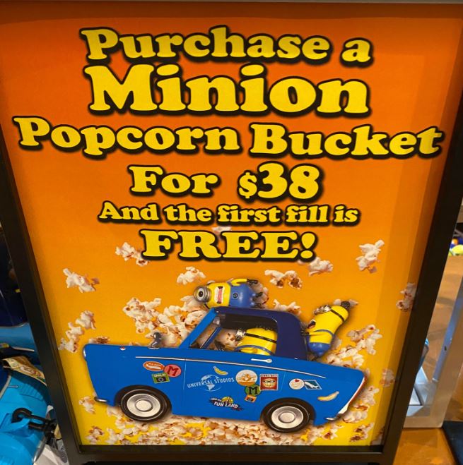 The Minion popcorn buckets are $38 with the first fill being free. They can be found at popcorn stands in both parks and at Universal Studios Store in City Walk. At Universal Studios you’ll be able to purchase them at Super Silly Stuff and Universal Studios Store. At Islands of Adventure you’ll find it in The Trading Company.