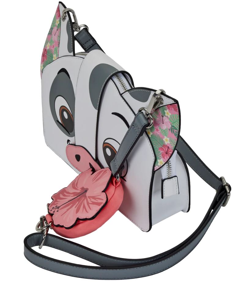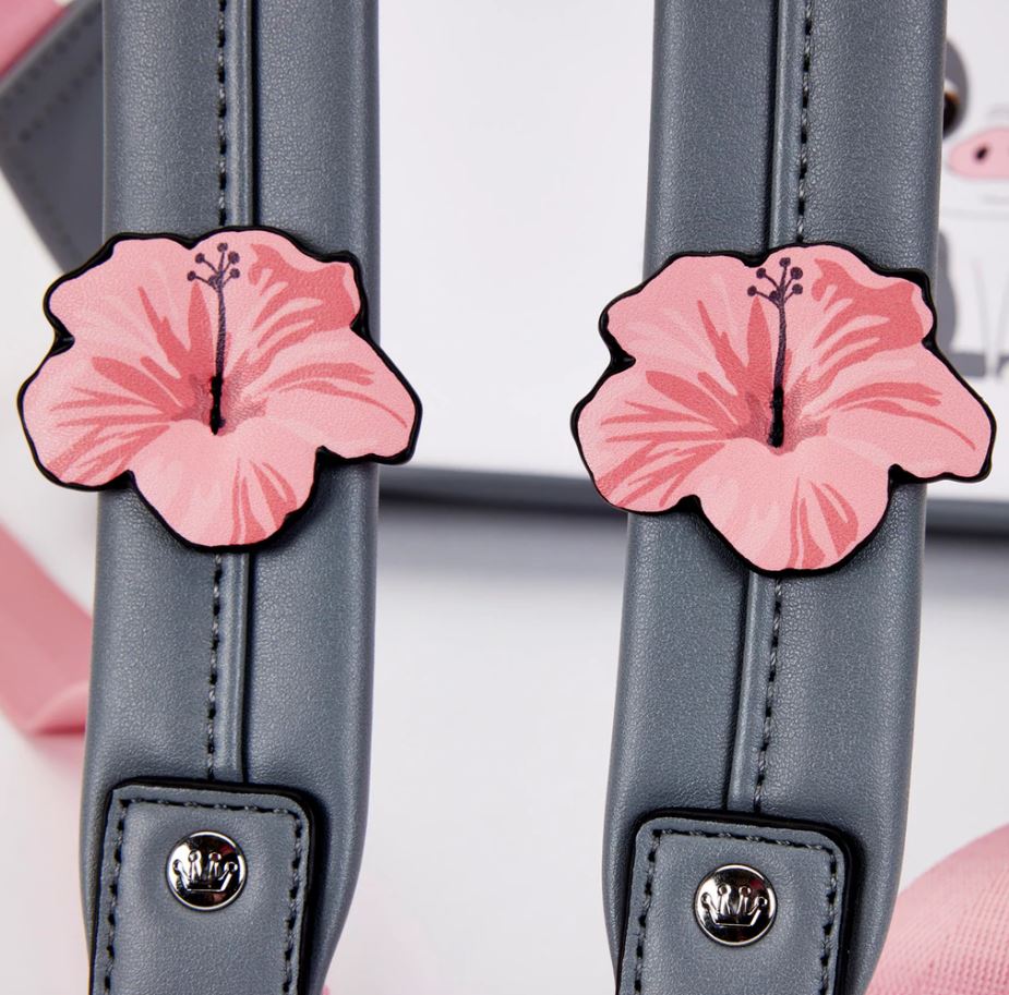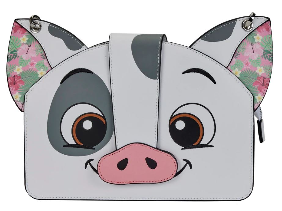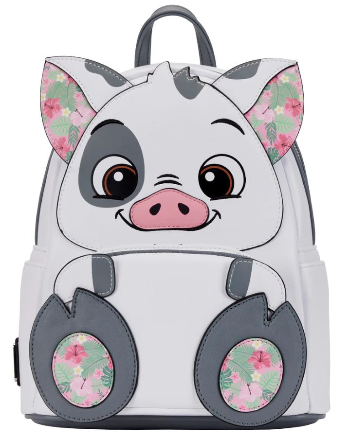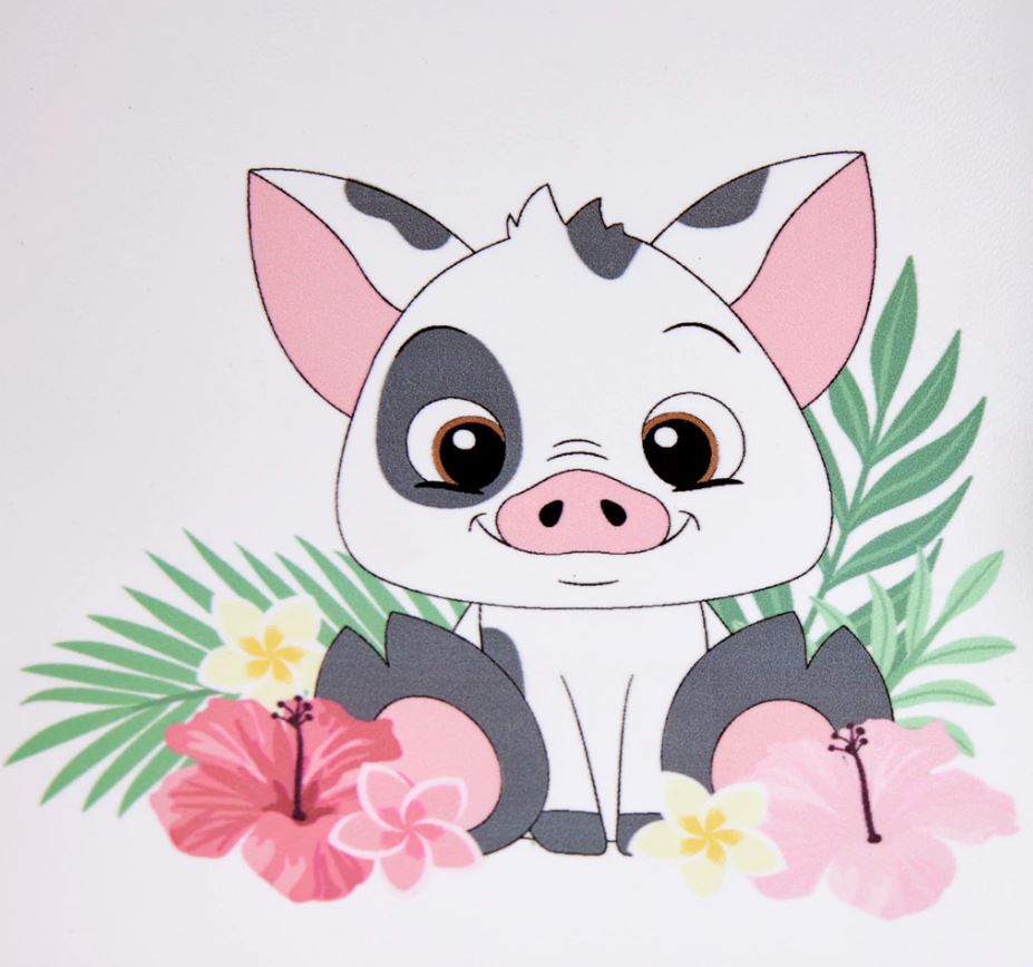 This is an adorable Pua from Moana mini backpack. Did you know that pua is Hawaiian for flower? Pua’a is Hawaiian for pig. Here we get both. The bag has hibiscus and plumeria print. By the way, moana means sea.