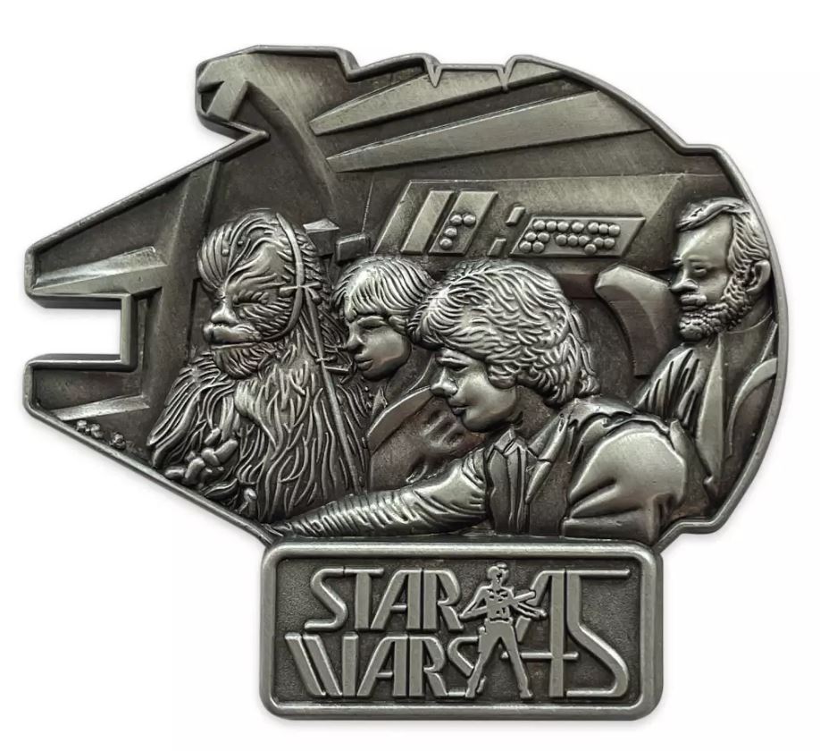 The first pin is the Millennium Falcon and has Chewbacca, Luke Skywalker, Han Solo, and Obi-Wan Kenobi. The second is Darth Vader in a TIE fighter. The third is Luke Skywalker with the classic Star Wars logo. You’ll notice that Luke is also on the other two pins with the logo and “45.”