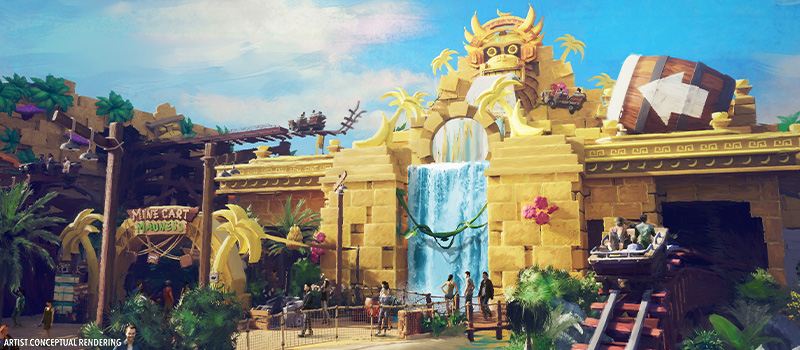 - Mine-Cart Madness: Guests will hop into a mine cart and careen through the jungle to help Donkey Kong and Diddy Kong protect the coveted golden banana on this first-of-its-kind family coaster. Utilizing an unprecedented ride system, innovative technology, and a unique coaster design, Mine-Cart Madness will send riders on a thrilling adventure where they will experience the jaw-dropping maneuvers that they’ve seen Donkey Kong and the mine carts perform in the video games – including getting blasted out of a barrel, seemingly jumping over gaps as they speed along a rickety track, and so much more.