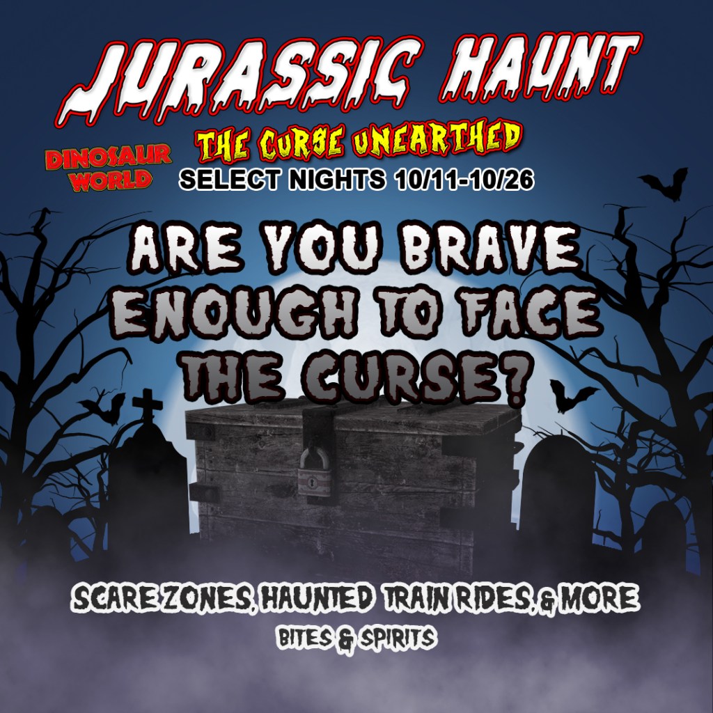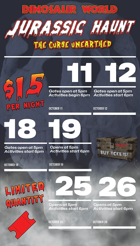 Tickets for the event are $15 and can be purchased here. Day admission ticket holders with tickets dated10/11/24, 10/12/24, 10/18/24, 10/19/24, 10/25/24, and 10/26/24 INCLUDE Jurassic Haunt and DO NOT require additionaladmission tickets to attend. Jurassic Haunt tickets are date-based – guests can only attend on the date their ticket states.