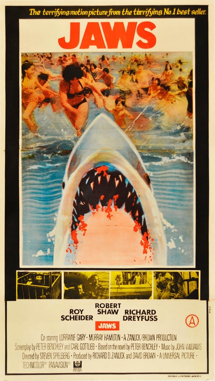 Jaws was released on June 20, 1975. It is adapted from a novel by Peter Benchley written in 1974. The movie rights were purchased prior to publication. Stephen Spielberg was the young 26 year old director. It starred Roy Shceider (Chief Martin Brody), Richard Dreyfuss (Matt Hooper), Robert Shaw (Quint), Murray Hamilton (Mayor Larry Vaughn), and Lorraine Gary (Ellen Brody).