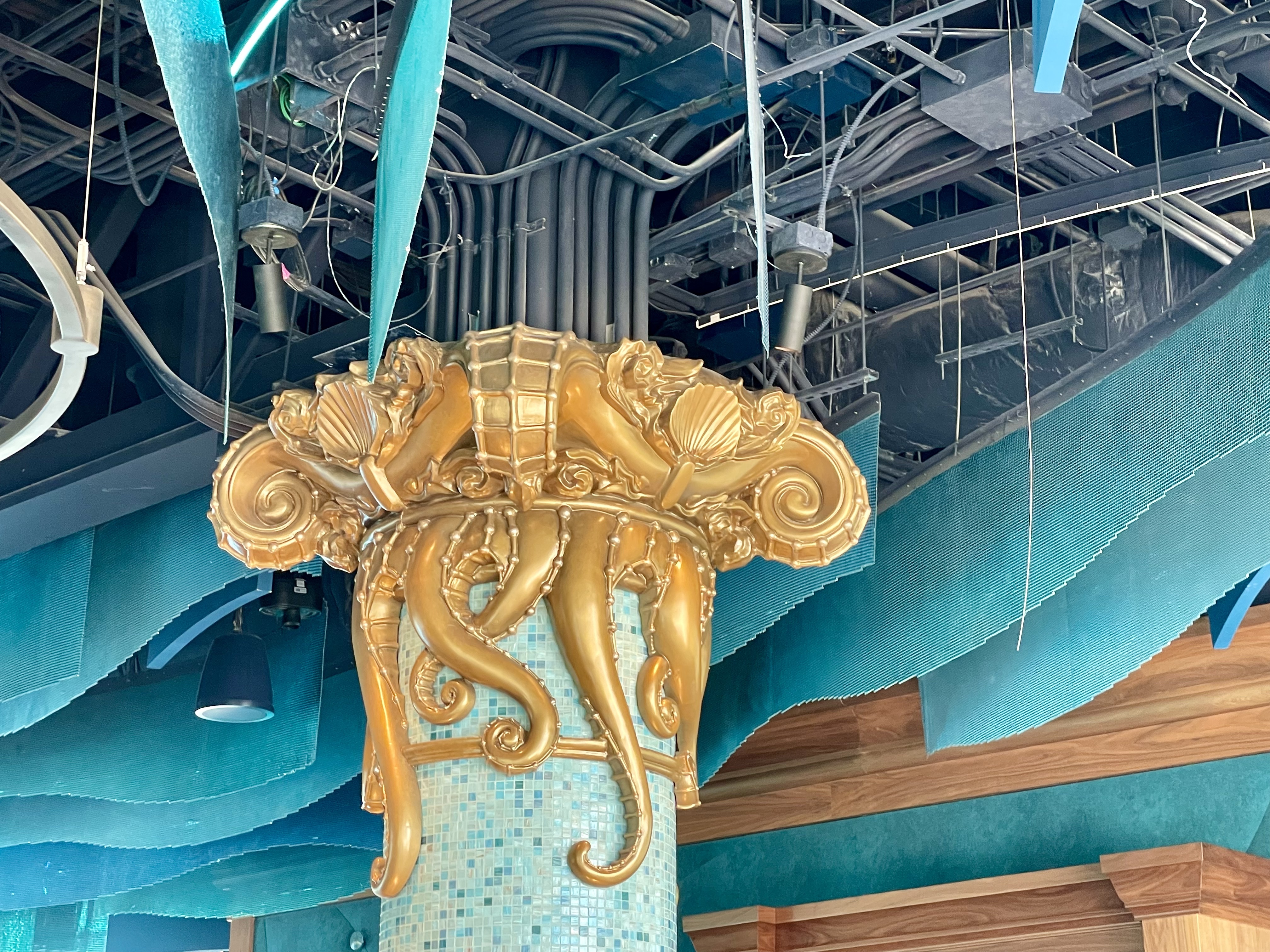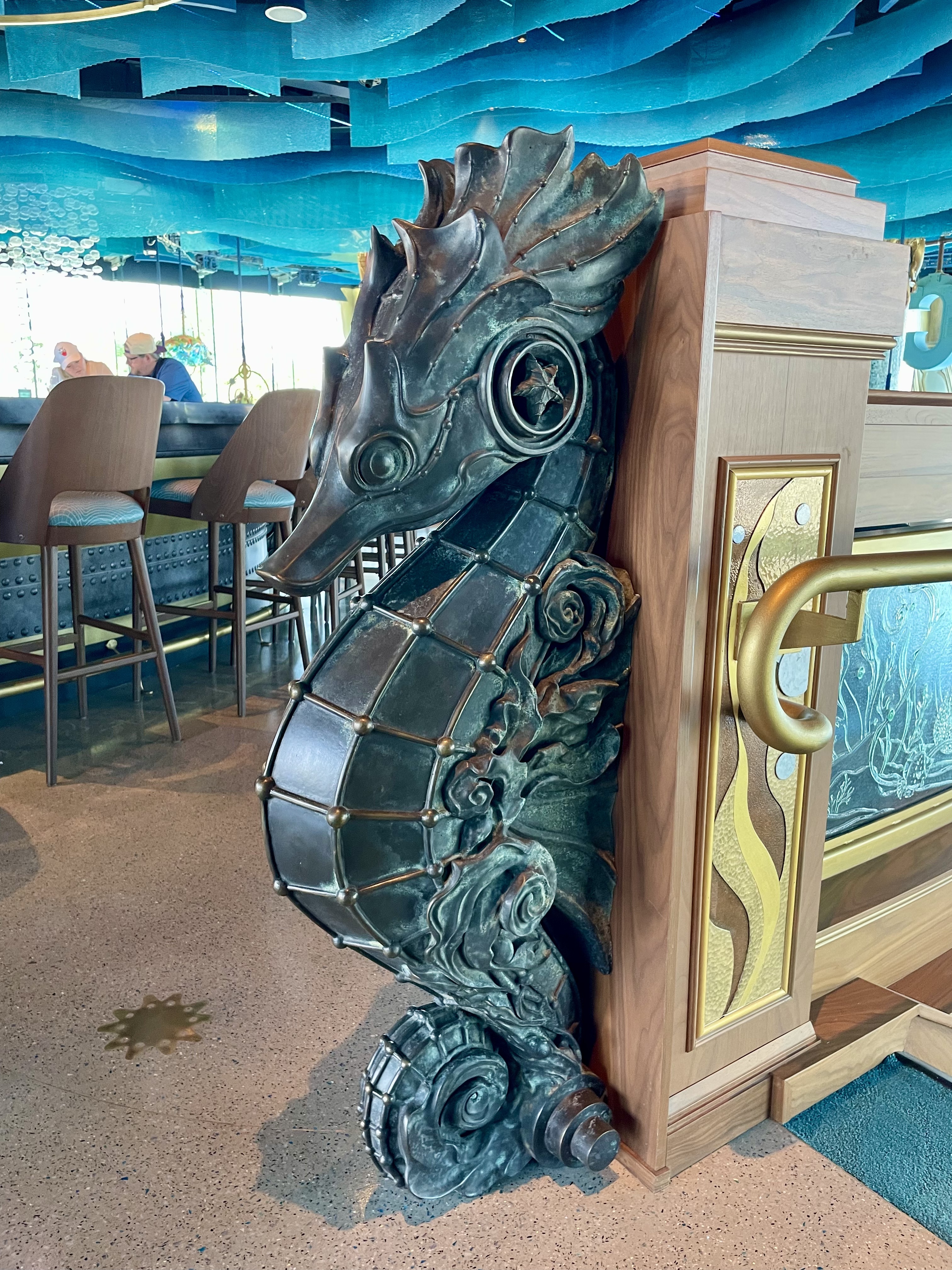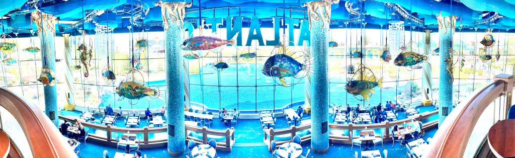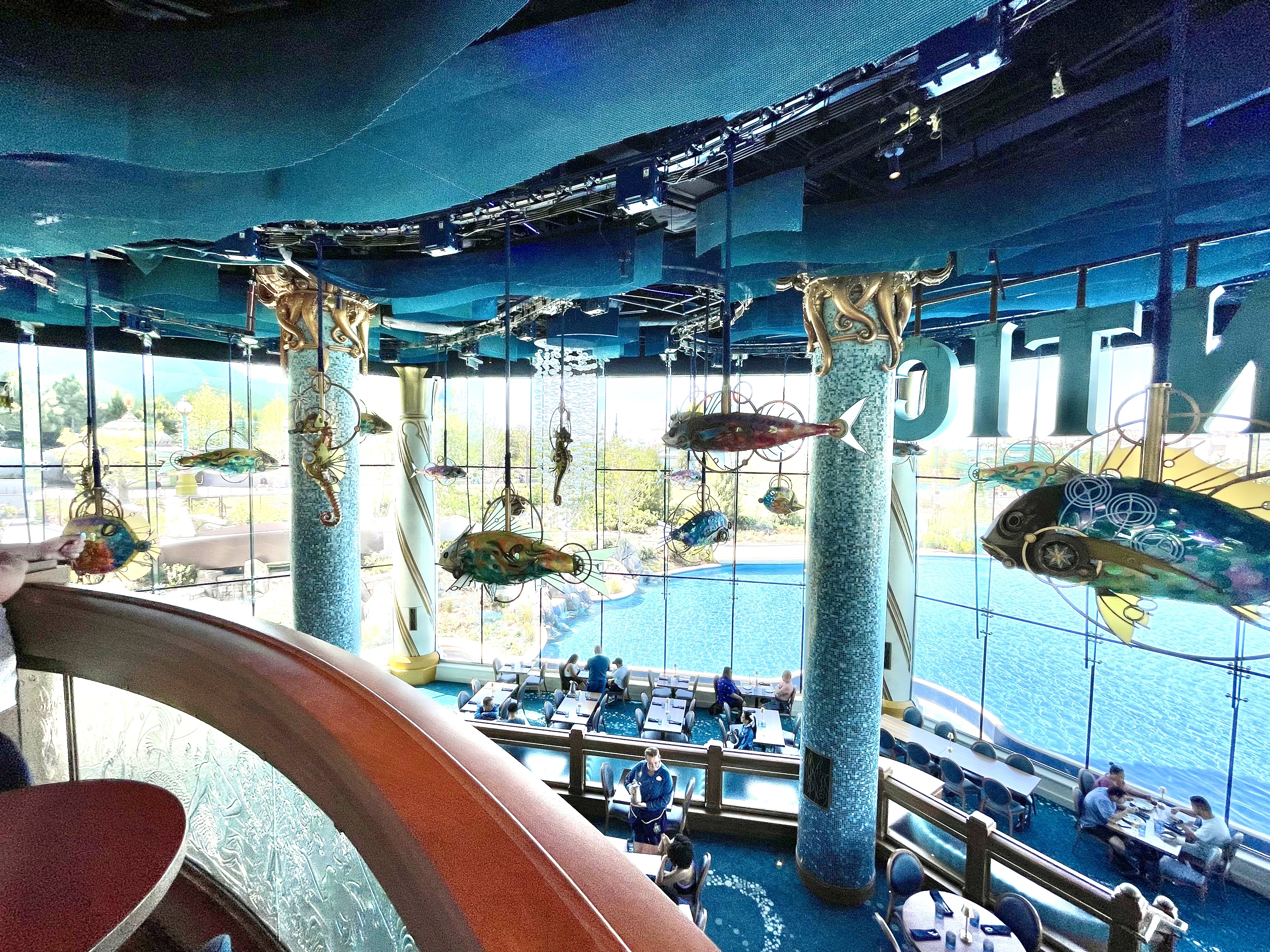 From the bubble carpet and chandeliers to the water and swimming fish above, this is a wholly immersive dining experience. It’s breathtaking, grand, and whimsical. It’s easy to forget that you are in a theme park.