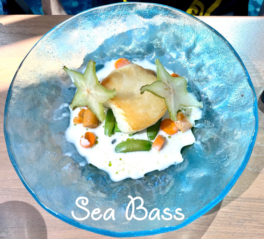 Sea Bass – carrot mochi, sugar snap peas, lemongrass broth, star fruit.