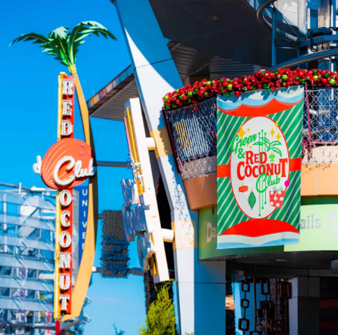 At Universal CityWalk, the Red Coconut Club will transform into the Green and Red Coconut Club for the holiday season, complete with festive decorations, live entertainment, and holiday cocktails. This year’s theme is the “Mistletoe Pines Ski Lodge,” where guests will enjoy nods to their favorite Holiday songs amidst a vibrant atmosphere of dancing lights. Upstairs, guests will encounter Earl the Squirrel, who has brought his usual chaos and charm to Earl’s Twelve Days of Christmas. Guests can also meet this beloved Universal character on select dates in CityWalk Plaza.